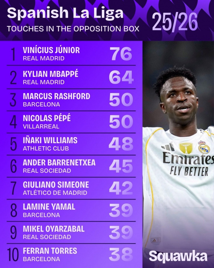Tin tức ngày 7 tháng 10 Gần đây, Squawka đã đếm số lần chạm trong khu vực hình phạt mùa này, với Vinicius xếp hạng đầu tiên sau 76 lần và MBappe thứ hai sau 64 lần.