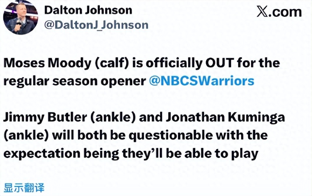 Theo phóng viên Dalton Johnson, Warriors đã phải chịu đòn trước trận khai mạc. Trong số đó, tiền vệ 23 tuổi Moses Moody sẽ nghỉ thi đấu và bỏ lỡ trận mở màn. Ngoài ra, 2 tiền đạo Jimmy Butler và Jonathan Kuminga cũng đang dính chấn thương và hiện đang nằm trong diện nghi vấn.